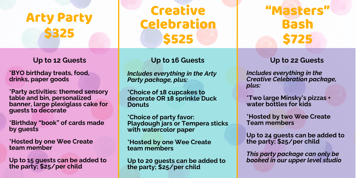 Wee Create has three amazing packages to choose from! Each package comes with different options, guest counts and staff support. Please note: Wee Create can safely host up to 24 (children) guests. We ask that you notify us if additional adult guests will attend.