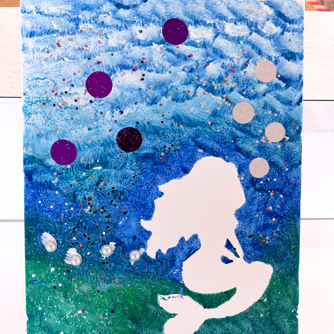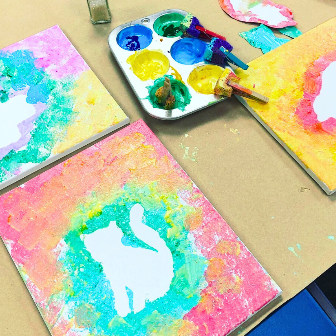 Create the party of your child’s artistic dreams, as they become the “artist” and create their very own canvas! This project is very adaptable to any party theme you are using. We can make themed cut-outs for the kids to paint around that will overlap perfectly with the rest of your party style! These cute cut-outs will create white “negative” space in their painting! They will also add some collage materials and get to glitter their paintings to their heart content!