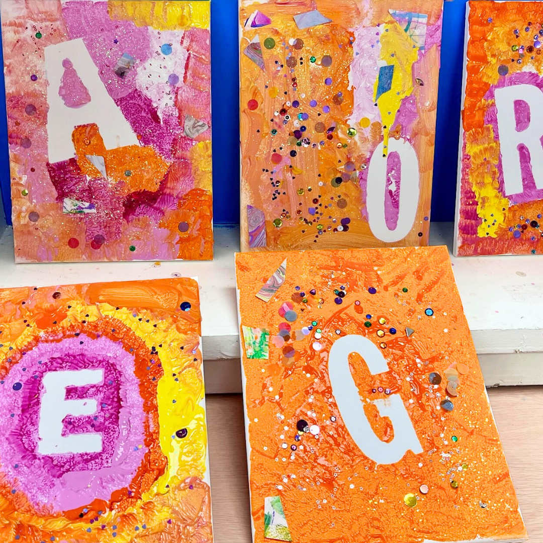 For the “older” artist, we also have a “scrape” painting style they can try! Using small “scrapers” and a variety of colors, they will create a fun abstract background for their paintings. Once their backgrounds are set, we will set out a variety of collaging materials for them to add lots of personalization!